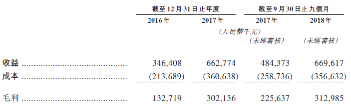 据招股书,锦欣生殖医疗集团的收益主要来自提供辅助生殖服务、管理服务及辅助医疗服务。于2016年及2017年以及截至2017年及2018年9月30日止九个月,公司收益分别为3.464亿元(人民币,下同)、6.628亿元、4.844亿元及6.696亿元。于2016年及2017年以及截至2017年及2018年9月30日止九个月,该集团的期间利润及全面收入总额分别为1.037亿元、1.986亿元、1.507亿元及2.028亿元。