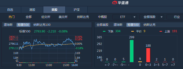 鲍威尔证词及较差楼市数据压低股指,周二美股微跌,截至收盘,标普跌0.08%,道指跌0.13%,纳指跌0.07%。