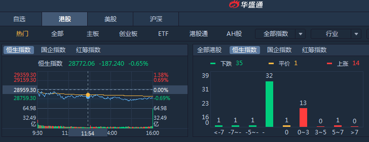 昨日,恒指早盘高开0.05%,随后震荡走低,尾盘跌幅稍有收窄。截至收盘,恒生指数跌0.65%,报28772.06点,全日成交额达1334.99亿。