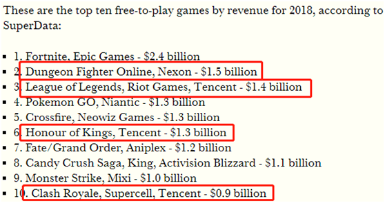 而且腾讯拥有Epic Games的40%的股权,100%的Riot Games股权以及84%的Supercell股权,11.5%制作《绝地求生》的蓝洞股权,而这些公司的大作,例如Epic Games去年的《Fortnite》都已是大卖特卖。
