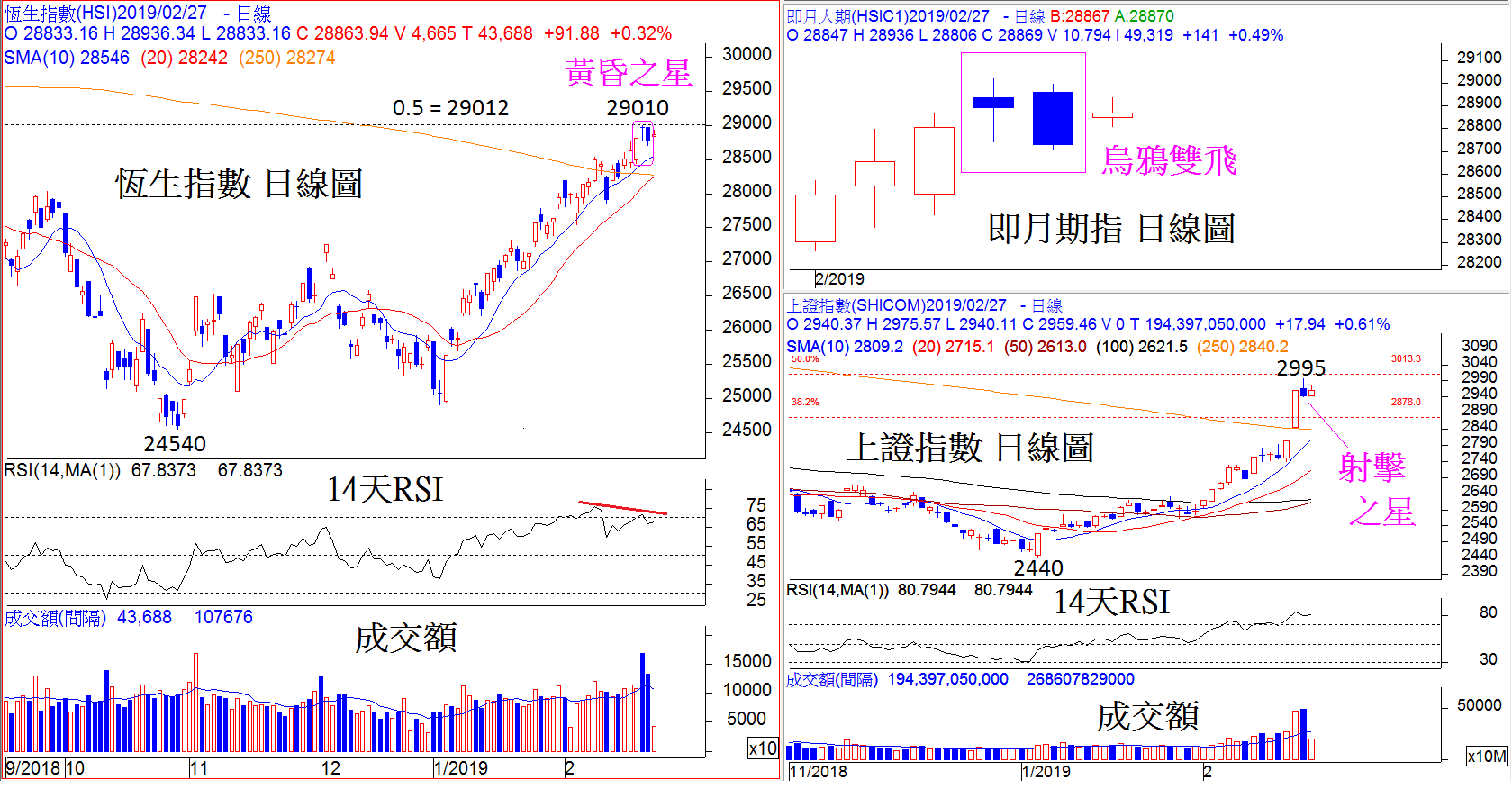 實際市況顯示,恆生指數在2月25日創下29010的新高,然後在日線圖上以「十字」形態收市,翌日,恆指即以陰燭下跌,雖然陰燭的長度有限,但也構成類似「黃昏之星」的強烈見頂形態。若從2月期指的日線圖看,則會發現高位呈現「烏鴉雙飛」的見頂形態。
