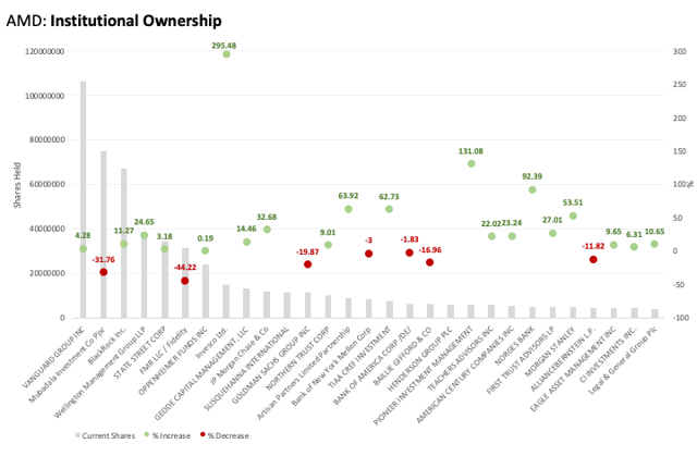 如下图所示,近期趋势是机构投资者一直在追加AMD的仓位。在其最新提交的13F文件中,29家最大机构投资者中,有22家披露增持了AMD的股票,而只有7家机构减少了对AMD的敞口。其中,持股数排在第11位和第19位的机构Susquehanna和Henderson Group分别增持了938%和1864%,由于增持幅度太大,为了显示方便,并没有在下图中展示。