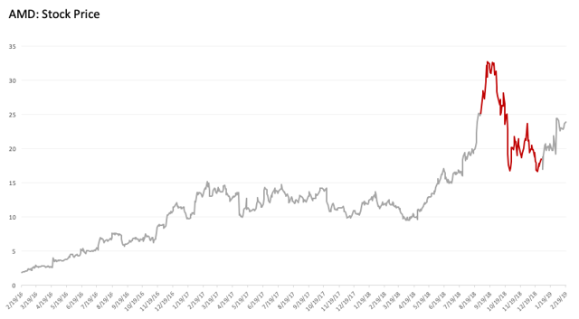 那么,这些机构以什么价格买入AMD股票的呢?或者换句话说就是,机构认为在这样的价格区间下AMD是被低估了,值得买进。尽管机构投资者不会透露具体的成交价格,但是在13F报告的时间周期中,AMD的股价在每股16.5到32.5美元之间,如下图所示,因为是在下降通道中,实际成交价可能接近于区间的16.5端。随后公司股价上涨,也映证了机构的看多观点。对于散户长线投资者来讲,这一价格区间也是做多的合适时机。