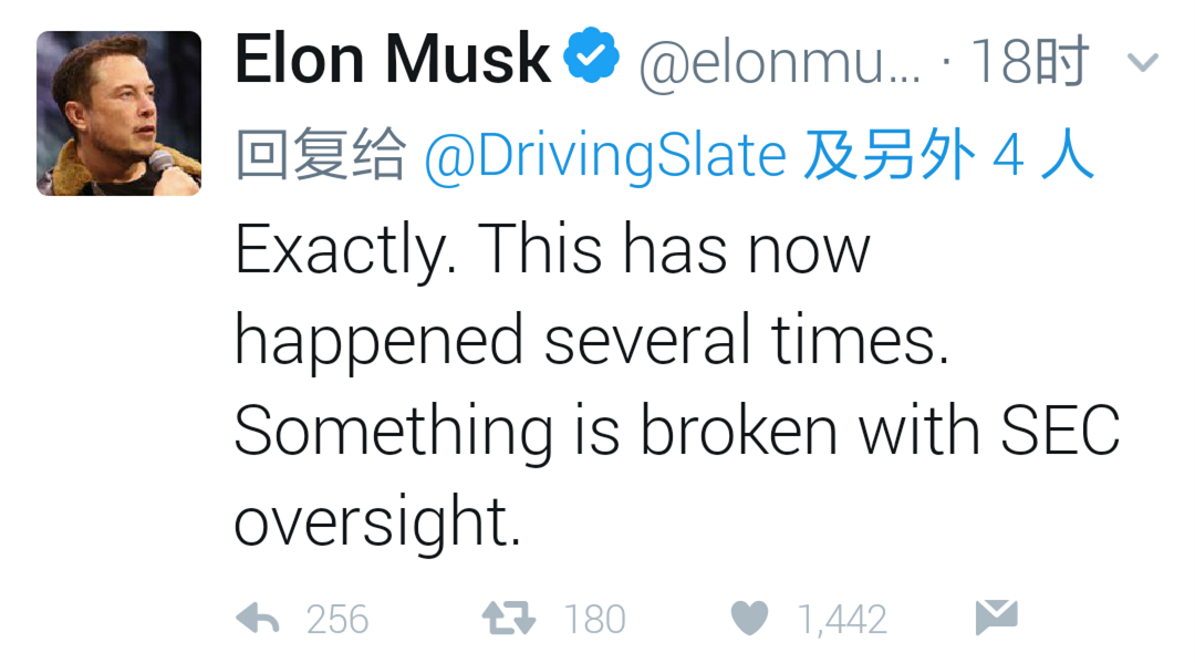 但马斯克并没有认输的意思,在昨日的推特留言的回复中,他称“SEC的监管有些问题”。