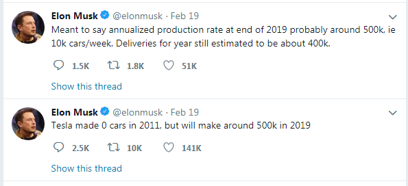 而罪魁祸首是下图中的两条推特,具体内容是马斯克称2019年特斯拉年产量将有约50万辆,之后修正为年化产量为50万辆,而预计交付量为40万辆。