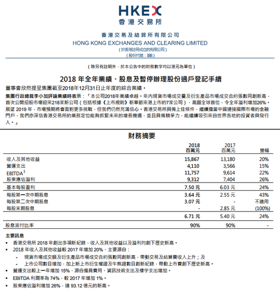 港交所(00388.HK)公布,截至2018年12月31日年度,实现收入及其他收益158.67亿港元(单位下同),同比增长20%;营运支出41.10亿元,同比增长15%;EBITDA117.57亿元,同比增长22%;股东应占溢利93.12亿元,同比增长26%;基本每股盈利7.50元;宣派第二次中期股息每股3.07元代替末期股息,连同第一次中期股息每股3.64元,全年股息创下每股6.71元的新高纪录,派息率为90%。