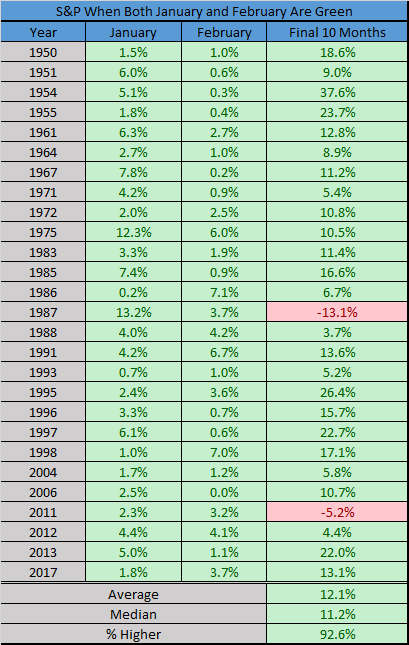 知名经纪商LPL Financial高级市场策略师Ryan Detrick发布的统计显示,自从1950年以来,标普500指数有26次在新年头两个月实现了背靠背上涨,而其中只有2次在全年余下的10个月中下跌,余下10个月的平均涨幅高达12%。