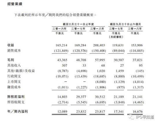 就毛利来看,2016-2018财年,嘉艺控股毛利分别为4336.5万港元、4870.8万港元和5799.5万港元,毛利率分别为26.2%,28.8%和27.8%。截止2018年9月30日的前6个月,嘉艺控股毛利3702.1万港元,毛利率24.1%。