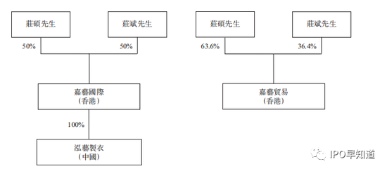 嘉艺控股就是典型的家族企业。嘉艺控股旗下的全资控股子公司共有三家,分别为嘉艺国际(香港)、泓艺制衣(中国)和嘉艺贸易(香港)。其中,庄硕和庄斌两兄弟分别持有嘉艺贸易63.6%和36.4%股份及嘉艺国际各50%股份,泓艺制衣则由嘉艺国际直接全资拥有。