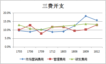 从三费开支来看,管理费用及市场研发费用基本维持在10-15%的区间以内,而市场营销费用在三季度和四季度大幅增长,分别占到了营收的18%及16%。管理层预计18年全年的市场营销费用将保持在15%左右,其中一三季度略高而二四季度略低。