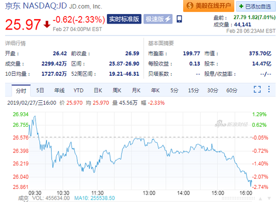 新浪财经 北京时间28日讯,京东报告第四季度利润出乎分析师预料,盘前股价大涨7%。财报显示,京东第四季度调整后每ADS收益0.51元人民币,市场预估亏损0.20元人民币。