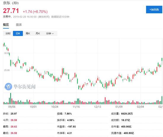 财报公布一小时后,中概股京东在美股盘前涨幅扩大至12%。当天京东高开,盘初一度涨至28.62美元、日内涨约10%,但此后随着美股大盘震荡下行,涨幅明显收窄,一度涨幅不足3%,最终收涨6.7%,收报27.71美元,盘中和收盘均创去年9月13日以来新高。