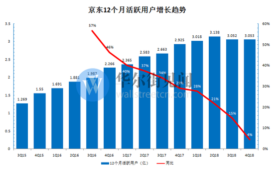 截至2018年12月31日,京东过去12个月的活跃用户数为3.053亿,同比增速跌入个位数区间。