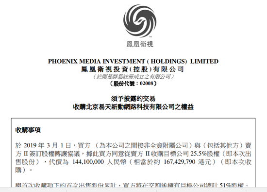 2019年3月1日,凤凰卫视与(包括其他方)方II股订转让协议,据此买方同意从卖方II收购目标公司25.5%股权(即本次出售股份),代价为144,100,000人民币(相当于约167,429,790港元)(即本次收)购)。于首次收购项下的首次出售股份累计,买方将在交割后拥有目标公司总计51%股权。