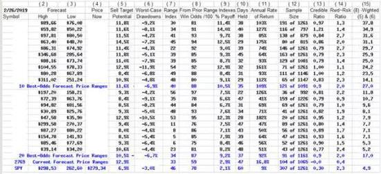 这不是传统的分析师对过去价格区间所做的“图表”。对于未来几周和几个月可能出现的价格区间的前瞻性预测已经成为历史。天气预报每天都在修改。预测价格区间的每条垂线,都被预测当天股票收盘价的点位分割成上行和下行前景。