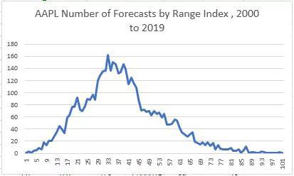 我们可以从做市商的对冲行为中得出隐含价格区间预测,这些行为在衍生品市场的公开记录中得到了证实。从本世纪初到2000年,苹果公司每天以完全相同的方式进行衡量。到目前为止,我们有超过4800个市场日数据,在目前的市场报价和预测的极端范围内提供超过4800个价格变化。