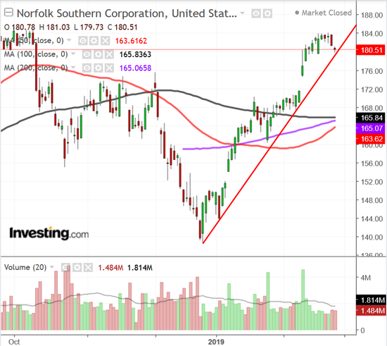 诺福克南方公司(NYSE:NSC)是一家从事铁路运输业务的控股公司,业务主要分布在美国东南部、东部和中西部地区。今年迄今为止该股上涨了21%,主要是受到了2019年及以后的乐观业绩指引所提振。周三,诺福克南方公司收于180.82美元。