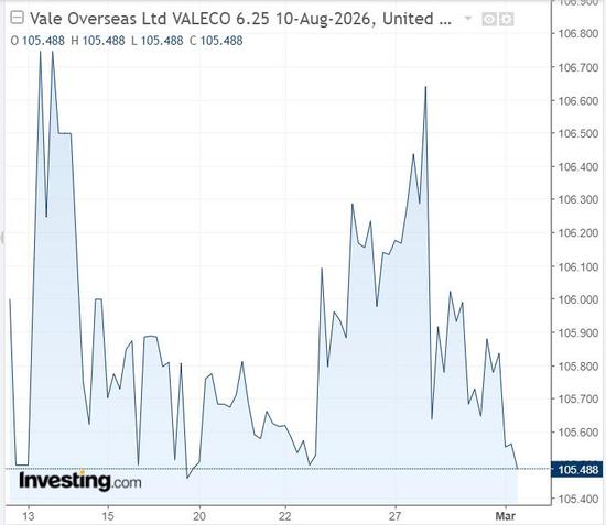 淡水河谷2026年8月到期债券收益率上涨、价格下跌,价格创2月19日以来新低。