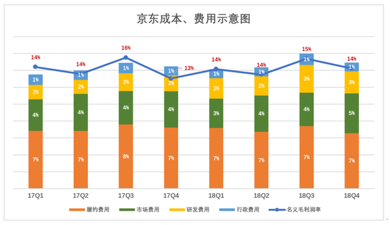 可以看到,代表名义毛利润率的蓝色拆线怎么也不能淹没代表各项成本、费用的彩色堆叠柱,也就是说无法取得经营利润。2018年Q4,京东经营亏损9.38亿,经营亏损率0.7%。