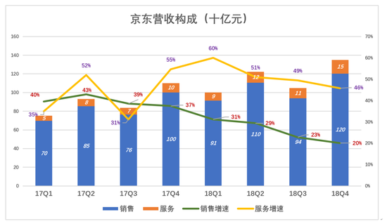 2018年Q4,服务性收入占总营收的10.8%,同比增速比自营销售收入高26个百分点。