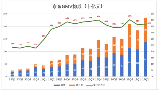 京东对GMV的重视自不待言,在2016年GMV同比增速仅47.4%、2017年预期不妙的形势下,京东“悍然”更改了GMV计算口径,从2017年Q3开始披露“新版GMV”并停止披露GMV构成(截至2017年Q2,第三方卖家贡献的GMV占比为42%)。