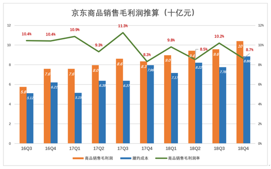 由于京东不单独披露商品销售及服务业务的营收成本,只好假设服务业务的毛利润率为60%,然后以此推算商品销售的毛利润。2018年Q4,商品销售“名义毛利润”及“名义毛利润率”分别为100亿、8.7%。