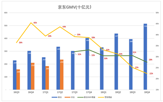 话虽如此,还是看下京东最新公布的GMV数据:2018年Q4,GMV为5114亿,同比增长28%,比营收增速高6个百分点,合乎逻辑的解读是第三方卖家占比显著提高。