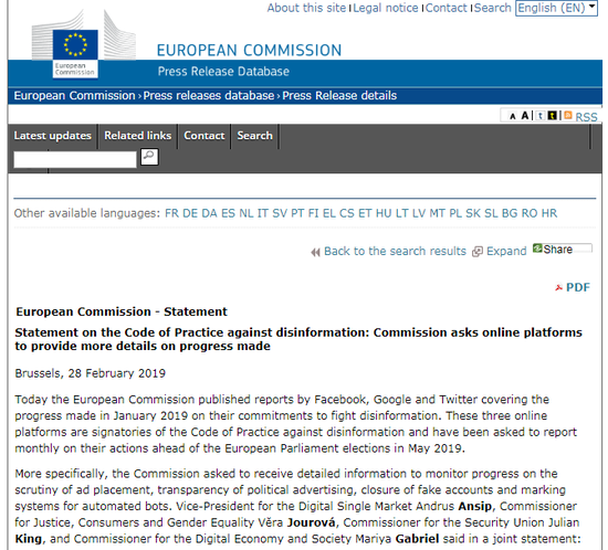 Facebook、Twitter和谷歌都因为没有在官方报告中提供足够的信息而被点名。官员们在周五的声明中表示,他们仍然“对情形表示担忧。”该声明促使这些平台在欧洲议会选举前更快地采取行动。