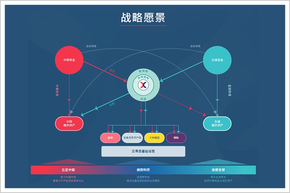 新规划中,港交所提出立足中国、连接全球和拥抱科技三大主题,其最终目标,是将港交所打造成为亚太区最大的上市交易所集团。