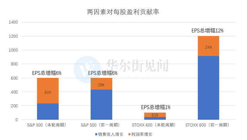 高盛分析称,导致企业盈利增长的两个主要因素分别为:销售增长和利润率增长。而据高盛的数据,在本轮经济周期中,无论是美国企业还是欧洲企业,利润率增长对盈利的贡献都显著高于销售增长,贡献率占比超过60%。