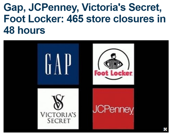 据报道,Gap、JCPenney、维多利亚的秘密(Victoria‘s Secret)和Foot Locker等大型连锁店都宣布大规模关闭,在过去48小时内总共关闭了465家门店。