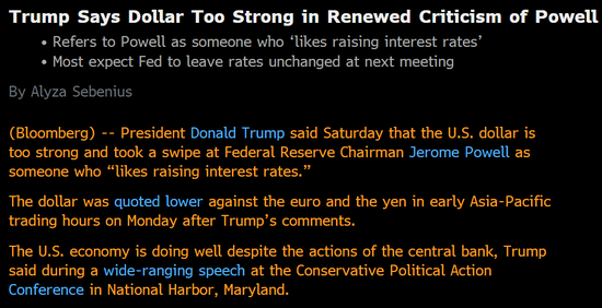 美国总统特朗普周六表示美元过于强势,称美联储的紧缩货币政策助长了美元走强,损害了美国的竞争力。还批评美联储主席鲍威尔是一个“喜欢加息”的人。