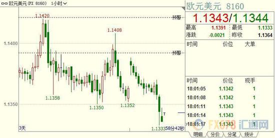 截至发稿,汇价下跌0.19%至1.1342。盘中创五个交易日新低至1.1333,日内最大跌幅为0.27%。
