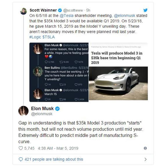 马斯克在回复互联网企业家斯科特-韦纳(Scott Wainner)的一条推特时表示:“理解上的差距在于,3.5万美元Model 3本月开始生产,但要到年中才能达到批量生产。要准确预测产量S曲线的中间部分是极其困难的。”
