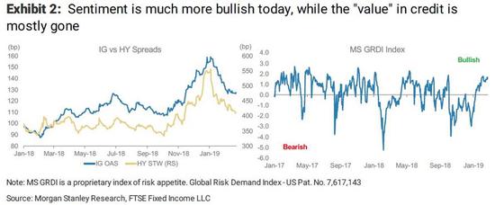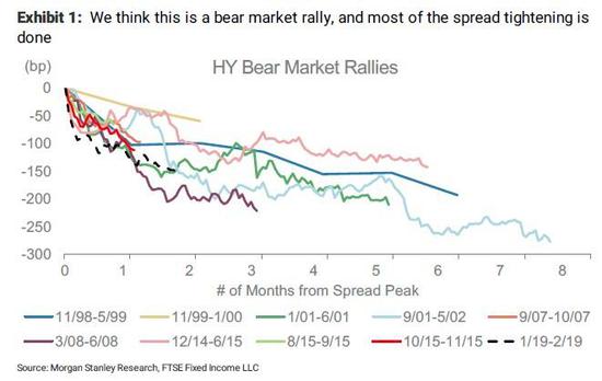 摩根士丹利的信用策略是Adam Richmond在题为“反弹时卖”的新近报告中称,美国信用债多仓的风险/回报不再有吸引力,基于去年末市场下行反应过度以及开始转而体现长期基本面的担忧,该行短期看多,但反弹已经到头,“几乎所有熊市都是间歇性的反弹,就像息差会定期扩大那样。”