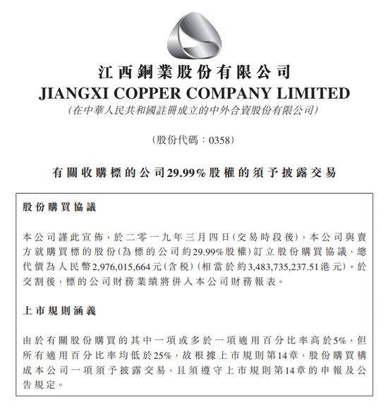 新浪港股讯 江西铜业股份发布公告,于2019年3月4日,公司拟收购恒邦股份29.99%股权,总代价为人民币29.76亿元。