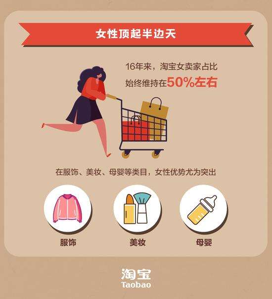 性别方面,女性一直是淘宝创业的主力军,2003年电商兴起之初,淘宝上的女店主占比达到62%,从2005年开始,男店主开始增多,但女店主占比始终维持在50%左右。在服饰、美妆、母婴等类目,女性店主优势更明显。