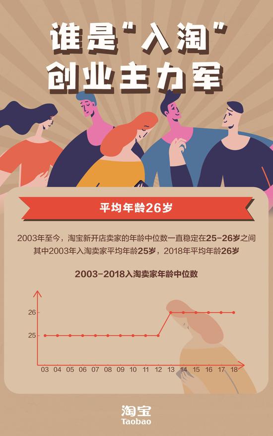新浪财经讯 北京时间5日消息 创业的最好年龄是多少岁?今天,一组来自淘宝的数据或许提供了答案:在对2003-2018每年新开店店主的年龄进行统计后,淘宝发现,16年来入淘创业者的平均年龄一直稳定在26岁左右,其中女性创业者占比稳定在50%左右。
