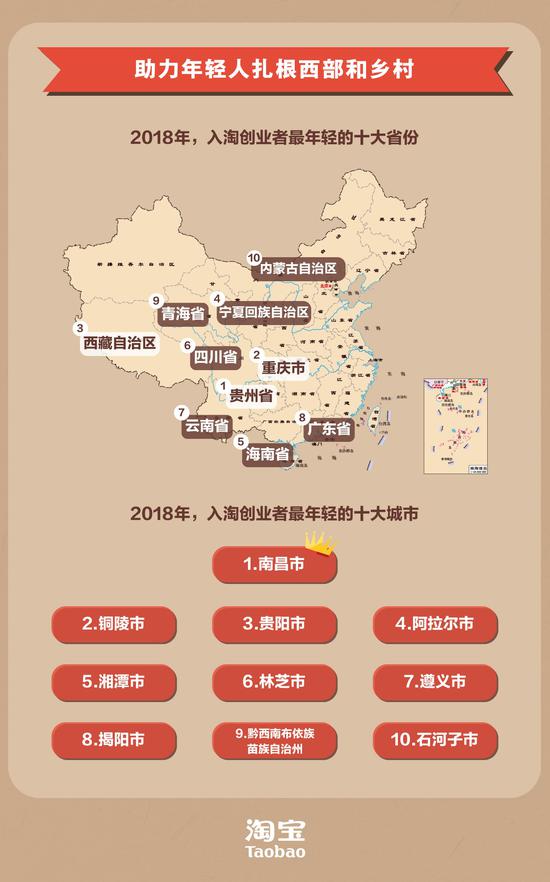 淘宝平台的普惠性,不仅促进了年轻一代的创业和就业,更助力年轻人扎根西部和乡村。数据显示,2018年,青年店铺占比最高(即入淘创业者平均年龄最小)的十个城市依次为:南昌市、铜陵市、贵阳市、阿拉尔市、湘潭市、林芝市、遵义市、揭阳市、黔西南布依族苗族自治州、石河子市。在创业积极性上,西部地区的年轻人胜过了长三角包邮区。