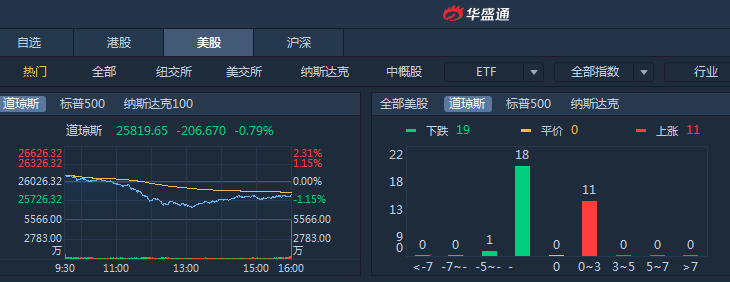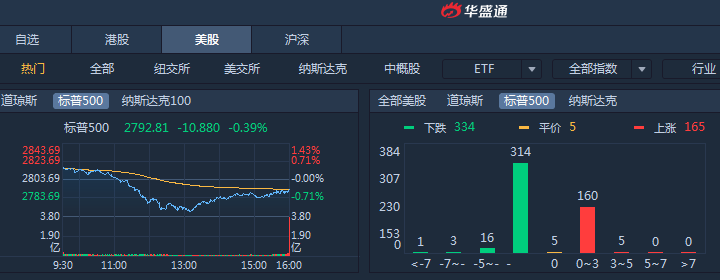 周一美股高开后集体转跌,道指一度跌400点,收盘标普500跌0.39%,道琼斯跌0.79%,纳斯达克跌0.23%。