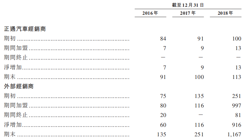 下图可见,2018年公司的正通汽车经销商为113家,而外部经销商由17年的251家迅速增长至2018年的1167家,增长超过3倍,反映出公司在去年的迅速扩张。