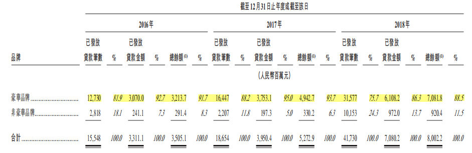 从车型来看,近三年豪华车贷款笔数占比均超过75%,贷款金额占比保持在90%左右,在零售贷款业务中占主要地位。