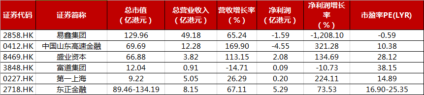 在其他多元金融服务领域,若以6.3港元的招股价上限计算,东正金融与易鑫集团的市值接近,但易鑫集团营收规模达到50亿港元左右,相比之下东正金融仅为8亿港元。而按招股价上限计算,东正金融的市盈率约25倍,在同业中估值偏高。