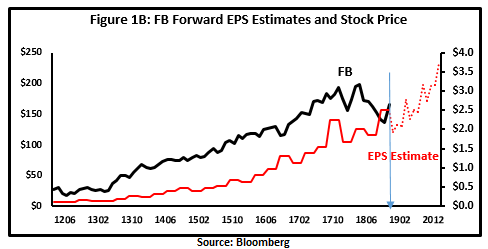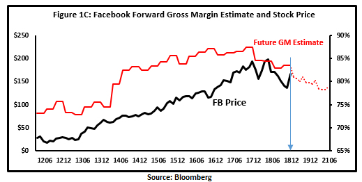 在这种“长期反转”的意义上,股价主要受管理指引和分析师对未来财务状况的估计影响。分析师的估计,如果有的话,将密切追踪管理指引,因为其中包含最具前瞻性的信息。因此,众所周知,Facebook的股价会对分析师对未来收入、每股收益、毛利率、自由现金流和资本支出的预测做出反应,这些预测用虚线表示(图1A -图1E)。值得注意的是,自2012年以来,股价主要是与五家积极向好的金融类股正相关。预计五分之四的未来财务状况(虚线)将改善,监管不确定性将得到解决,且公司定价和成交量的组合将得到改善。毛利润率预计将呈下降趋势,原因是与打击隐私问题和虚假账户相关的费用上升。
