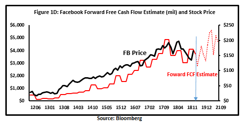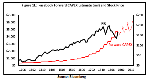 然而,在Facebook的收益预期在过去6个月下降了超过40%之后,股东们开始更多地关注未来的收益预期,而不是毛利率预期(图1A vs.图1C)。另一个好的迹象是,与这个动荡时期的许多其他公司不同,Facebook的自由现金流预计将增加(图1D),因为该公司预计2019年后不会降低资本支出(图1E)。