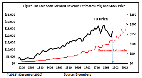 由于任何宣传活动都可能在任何一天对公司造成冲击,因此对一两个季度以上广告收入的简单猜测就变得不切实际。对于接受过更多技术培训、经常通过个人联系获得私人信息的华尔街专业分析师来说,他们通常甚至无法预测当前季度的收益报告。因此,超越财务预测所支持的点来估计未来的股票价格是不负责任的。使用这个标准,我只估计了Facebook在2021年第四季度之前的“长期”未来股价,因为这是提供一致财务估计的最远未来时间点。