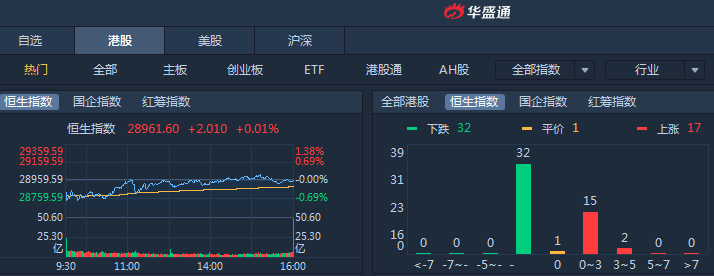 恒指早盘低开0.47%,随后震荡走升。收盘恒指涨0.01%,报28961.6点,全日成交额达1186亿。国企指数涨0.06%,报11582.61点,红筹指数跌0.34%,报4545.87点。