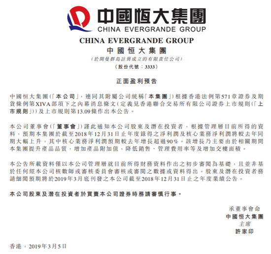 其中核心业务净利润预期同比增长超过90%。据了解,恒大2017年核心业务净利润为405.1亿,按此估算其2018年核心业务净利润达770亿以上,再度刷新行业最高纪录。