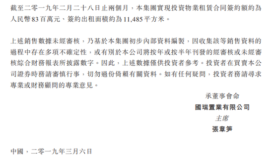 2019年2月,集团实现投资物业租赁合同签约额约为3300万元,签约出租面积约为4145平方米。该等投资物业租期从一年至七年不等。
