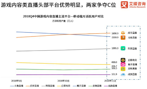 根据艾媒咨询发布的《2018-2019中国在线直播行业研究报告》显示,以MAU来看,虽然此前虎牙和斗鱼在移动端稳居第一梯队,但自2018年10月起,虎牙的数据一路上升,赶超斗鱼成为第一名。
